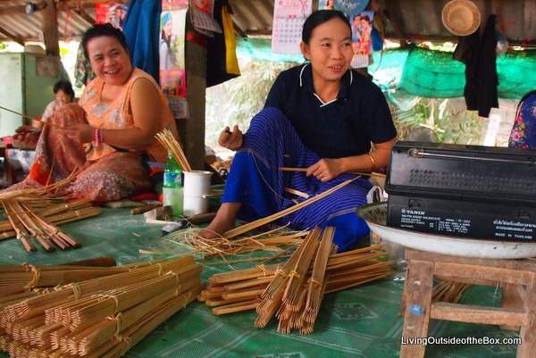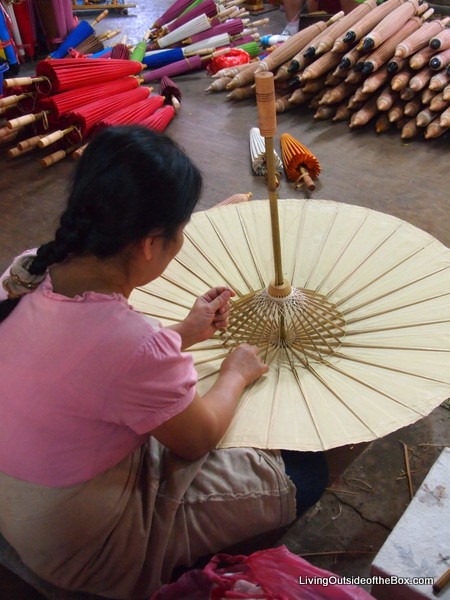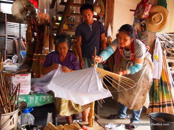 Bo Sang is a town that is known for its craft of traditional umbrellas. No Made-in-China umbrellas here!  We first rode into town and spotted a workshop that allows customers to wander and see the craft being done.
