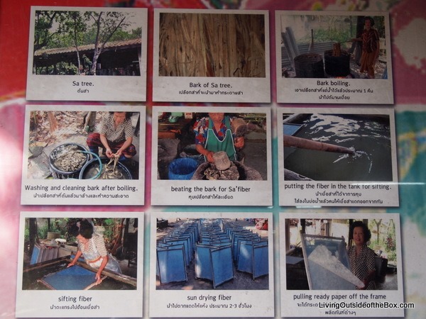 This poster board explained the process of taking the bark of the Sa tree, boiling it, cleaning it, and beating it into a paper that could be used for their umbrellas. They wrote: