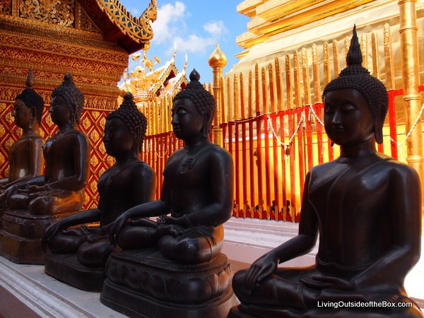Doi Suthep is a Buddhist Temple (Wat) towering on a mountain nearby Chiang Mai. It is a short drive from the city, and you can either hire a red songteow or taxi to take you there, or take motorbikes. We opted for the motorbikes—and were glad we did. As we climbed up the winding switchbacks, we were able to get a few glimpses of the city of Chiang Mai (pollution and all).