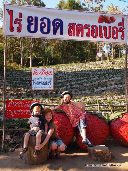 On the way back we stopped for yet more strawberries. Have I mentioned we’re addicted to berries?  This time we were approached by a young man selling treats to feed his baby elephant. You never know what you’re going to see on the roadside in Thailand…