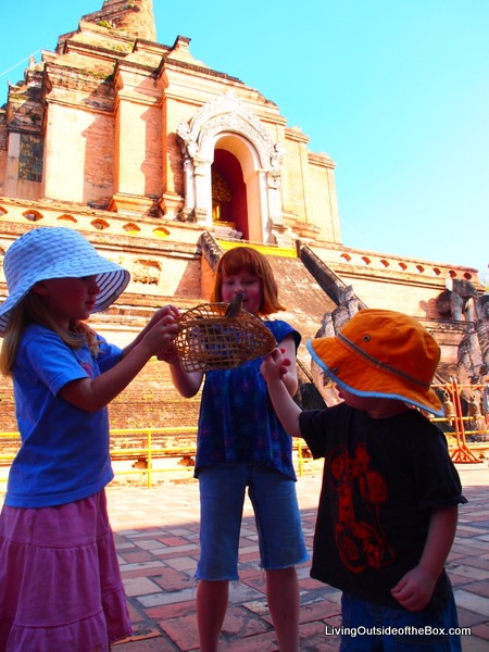 The kids saw this vendor sitting on the temple grounds, selling little birds to release. It’s such a silly thing…and after a wee bit of begging by the kids and short contemplation…we decided, “why the heck not?”