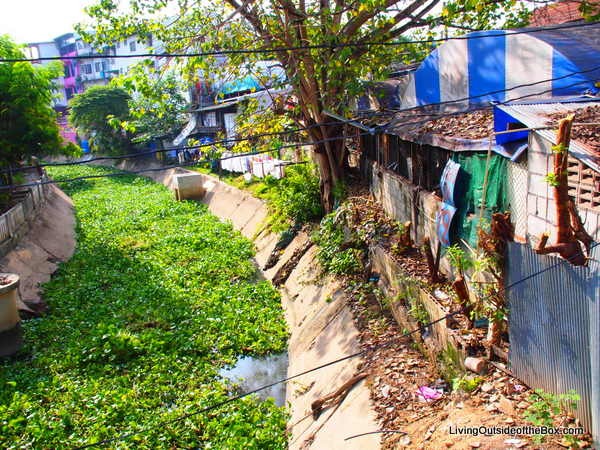 We end up wandering through a lot of small streets and alleyways as we make our way from the market area where our songteow drops us off…and where we actually want to go. Here’s a view of the back of people’s homes that line a small canal.