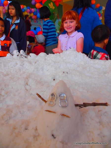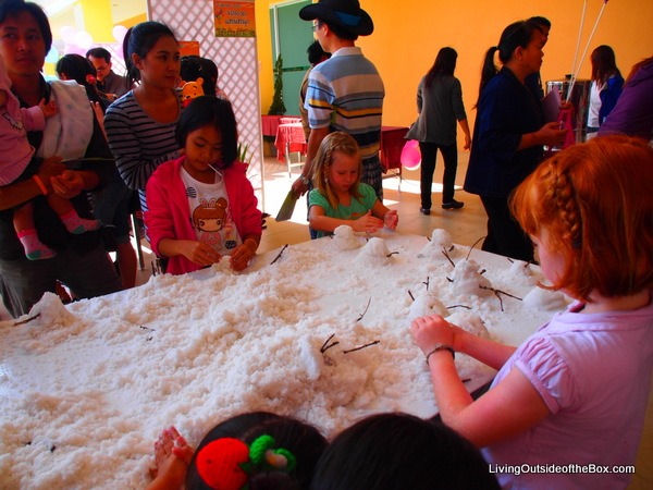 The kids activities were fairly limited…but amounted to some free bags of junk food, a stage where kids were (maybe) competing in a song competition, and a table of fake “snow” for the kids to build snowmen out of. Cool, weird stuff…but the kids enjoyed it!