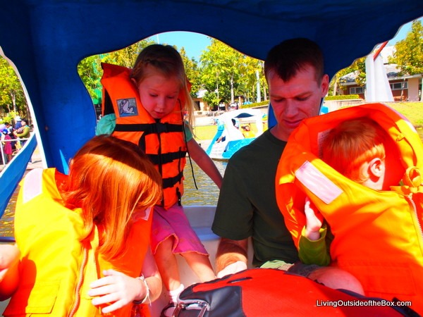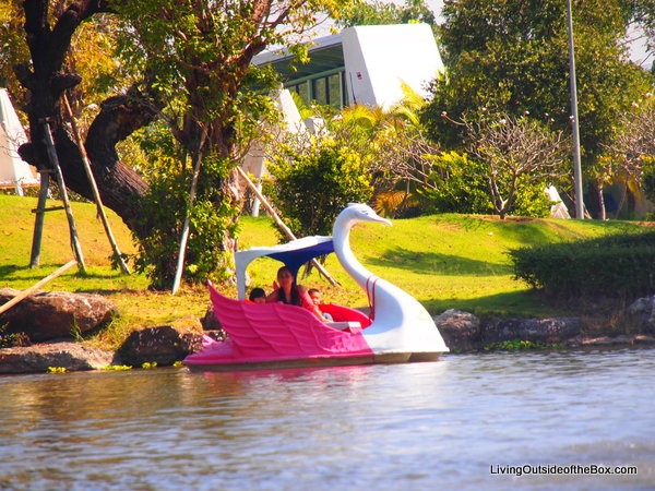 On the way to the playground we passed a pond where we could can rent Swan paddle boats for 15, 30 or 60 minutes at a time. The prices were 40, 70 and 100 baht, respectively. We rented the boat for 15 minutes, which turned out to be plenty long enough. After all, we didn’t all fit in the 2 seater swan very well…Ethan (who is under that life jacket somewhere) had to sit on Jared’s lap while he peddled with his feet, and I found myself balancing precariously in the neck of the swan so Ella could pretend try to peddle, as well.