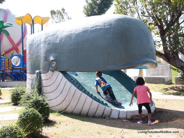 So, we found the playground, which had an awesome whale mouth slide that reminded me of my childhood days in Gage Park (Topeka, KS). I loved our whale slide Smile