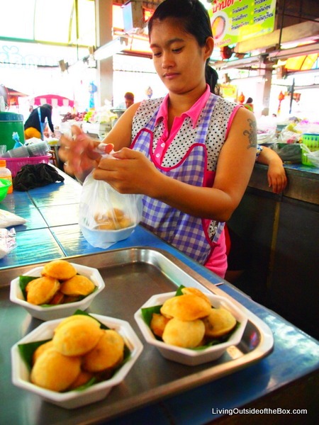We found some yummy “Thai pancakes,” which are made from coconut milk, chives, and corn, I believe. A bit wiggly jiggly…but yummy, for sure!